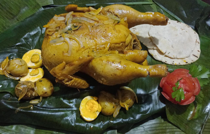 Gallina achiotada enjarrada, hecha a la leña